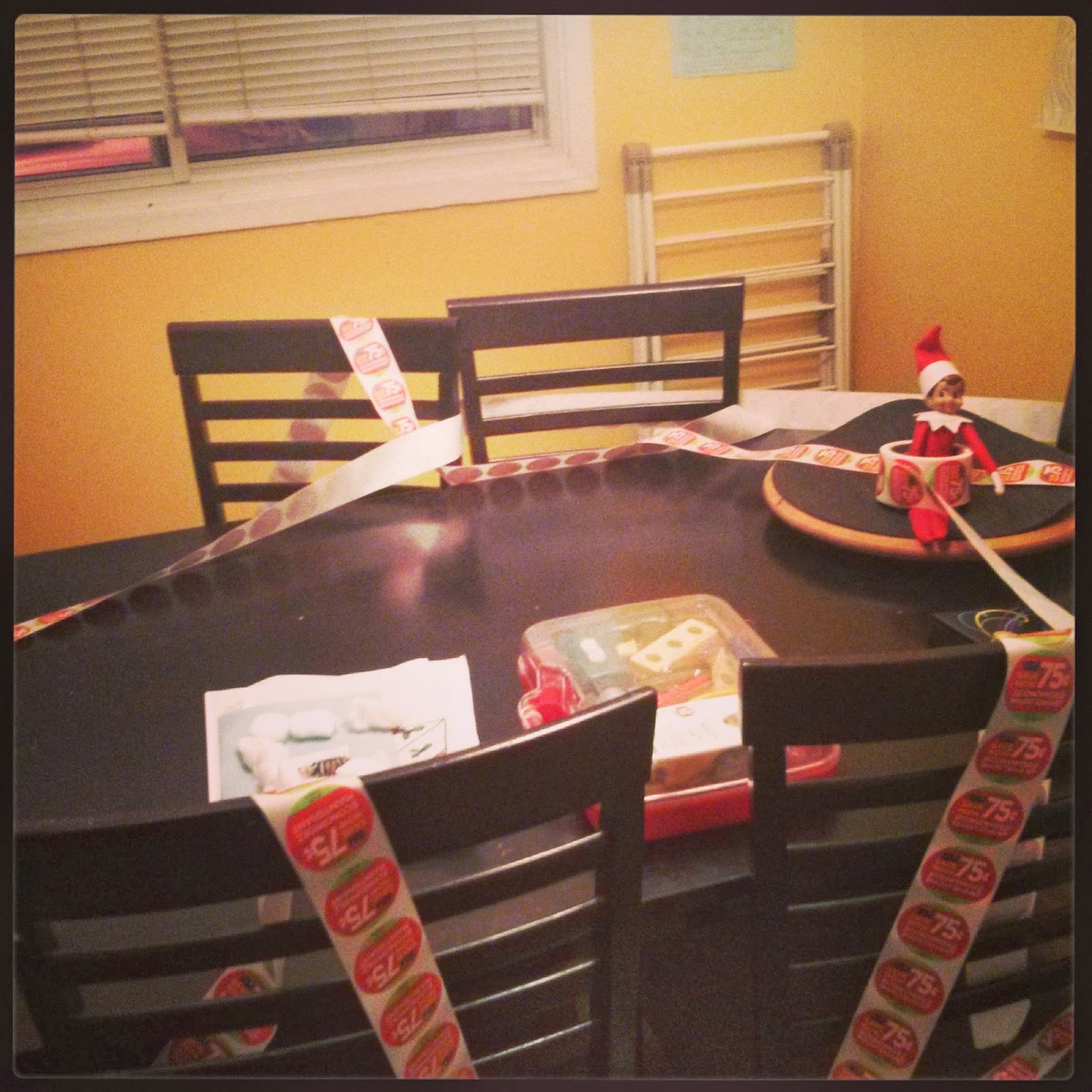Dernier jour pour notre lutin ici. Le père Noël viendra le chercher ce soir. Biscuit James en a profité pour finir de manger la maison de bonbons des enfants.